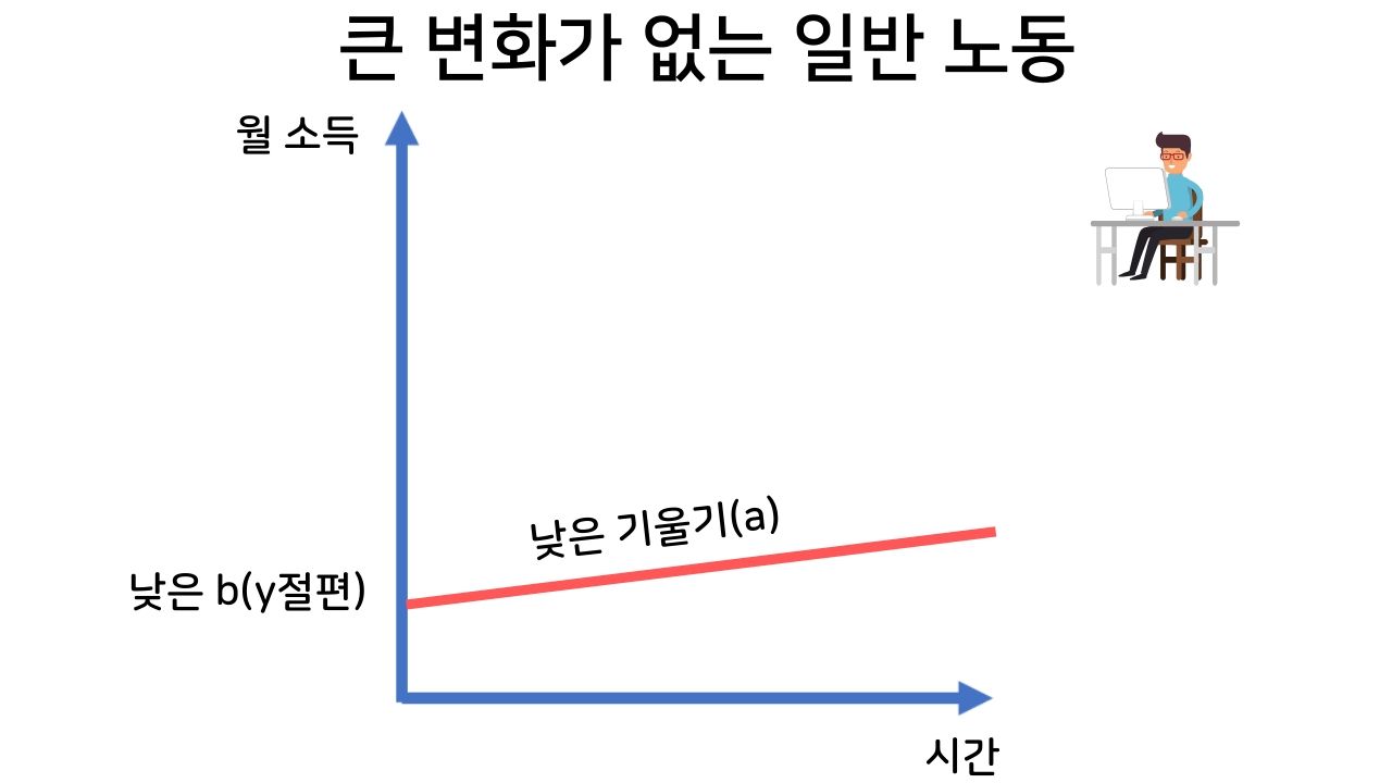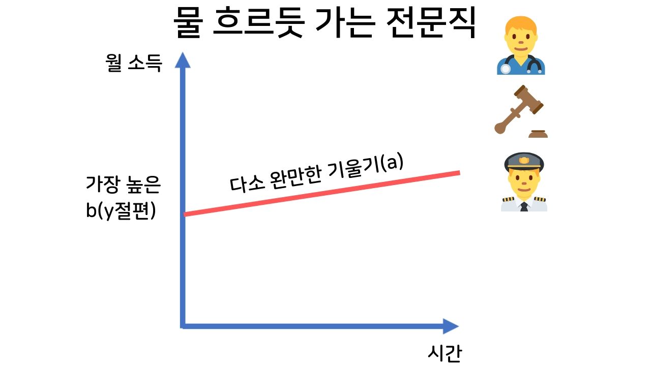 주변 친구 중에 전문직이 많다. 의사, 치과의, 약사, 파일럿, 회계사, 변호사 등과 이야기를 하면 한 가지 공통점이 있다. 이들은 20대 대학시절의 추억이 없다. 실제로 대학시절에 얼굴 보기가 힘들었다. 그들은 오로지 정신없이 전공 공부를 또는 고시공부를 하느라 바빴다. 20대 황금기를 희생한 결과 특수한 교육과 면허를 취득하면서 노동시장에 진입했다. 이를 수식으로 표현하면 b값(y절편)이 높게 나타난다. 전문직은 인력 양성에 필요한 엄청난 시간과 금액을 요구한다. 그래서 노동의 수요에 비해 공급량이 적기 때문에 노동의 가치가 높아 타 직업 대비 고수입을 올릴 수 있게 된다. 2016년 보건복지부 자료를 살펴보면 봉직의(페이닥터)의 평균 연봉이 1억 5300만원에 달하는 것으로 집계 되었다. 일반 노동자 대비 5배 정도로 추정된다.