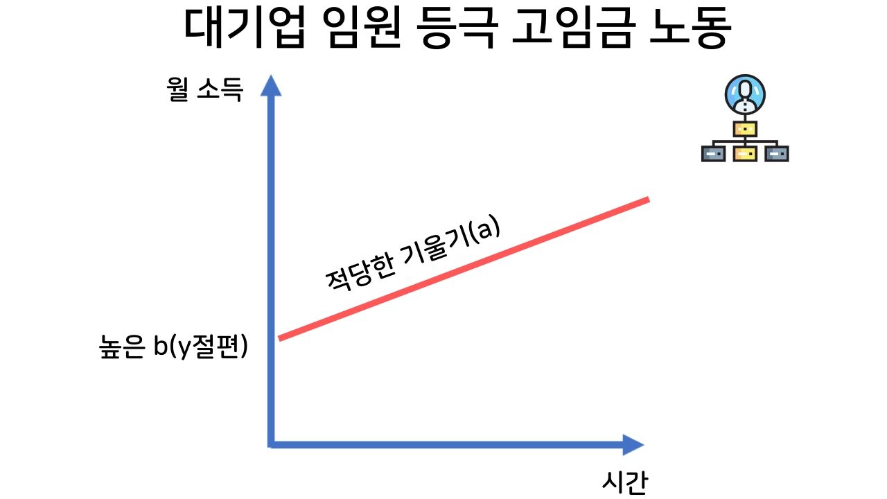 좋은 학위와 전공으로 노동시장에 진입한다. 다만 전문직에 비해 인력 양성에 필요한 시간과 금액이 적기 때문에 b값(y절편) 값은 전문직에 비해서 낮다. 다만 40대를 기점으로 전문 직급 이상의 월 수입을 올리는 케이스가 등장하기 시작한다. 바로 임원 또는 전문가 대접을 받기 시작하는 시기가 이때쯤이기 때문이다. 한국경제 2019년 4월자 대한민국 10대 대기업 임원 평균 연봉을 살펴보면 평균 4억 5,300만원으로 나타났다.