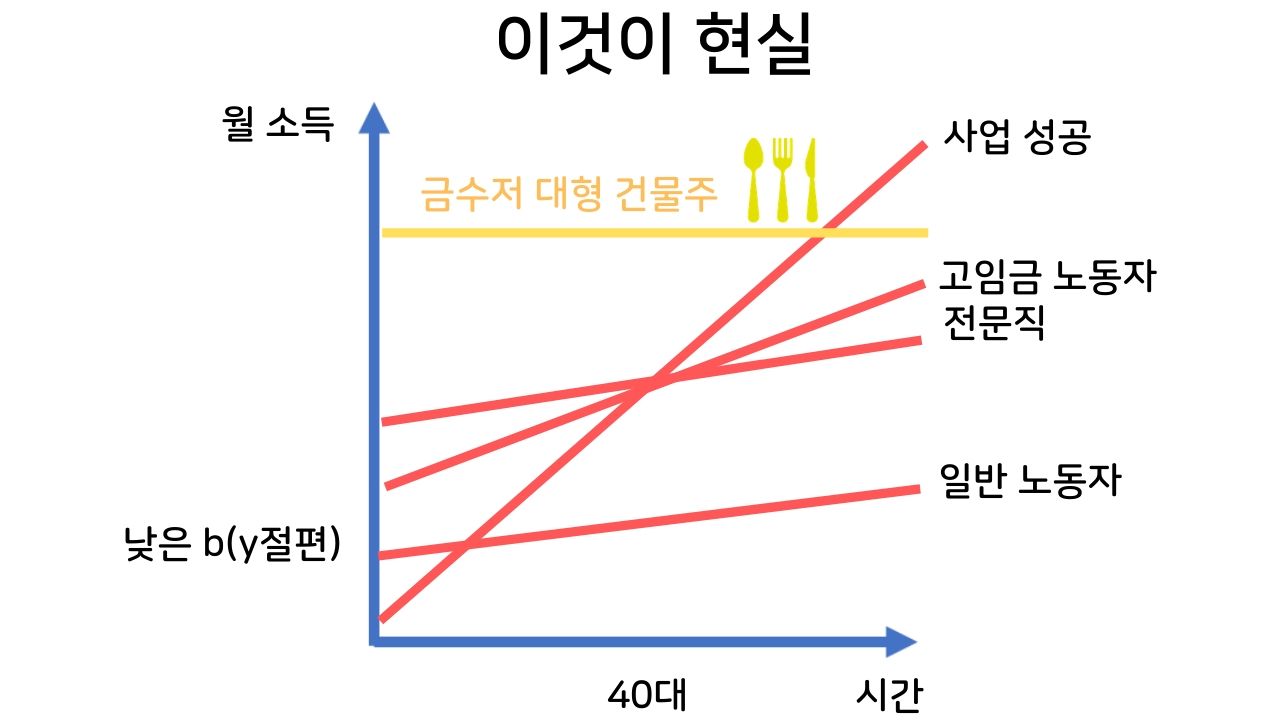 그래서 노동을 통한 소득을 빠른 시간 안에 올리고 싶으면 모든 직종에서 기울기 a를 올려야 한다. 정규 교육으로 형성되는 b값(y절편)을 넘으려면 높은 기울기 밖에 없다. 그리고 y절편값이 높으면 시작이 유리하기 때문에 이를 철저히 활용해야한다. y절편 값이 높으면 사업을 하더라도 시작점이 높아서 유리하다. 어쨋든 현실은 자본소득이 대세지만 희망을 잃지 않고 매일 매일 우리의 역량을 어떻게 올릴지 조금이라도 고민할 필요가 있다.