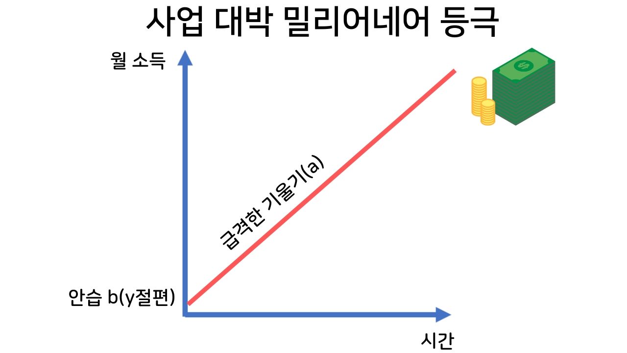 하지만 맨땅에서 하는 사업 초기는 사업이 안돼서 손가락을 빨아야 되는 경우가 부지기수다. 그러한 이유 때문에 b값(y절편)은 제일 낮다고 본다. 그리고 사업을 성공시키려면 부단한 노력은 기본이요, 남들과 차별화되는 특출 난 능력까지 겸비해야 한다. 사업을 하면 새로 알아야 할게 천지기 때문에 자기 계발은 물론이요 새로운 지식을 흡수하기 위한 부지런함까지 갖춰야 된다. 그래서 무에서 유를 창출한 성공한 사업가들은 높은 a값을 갖고 있다.