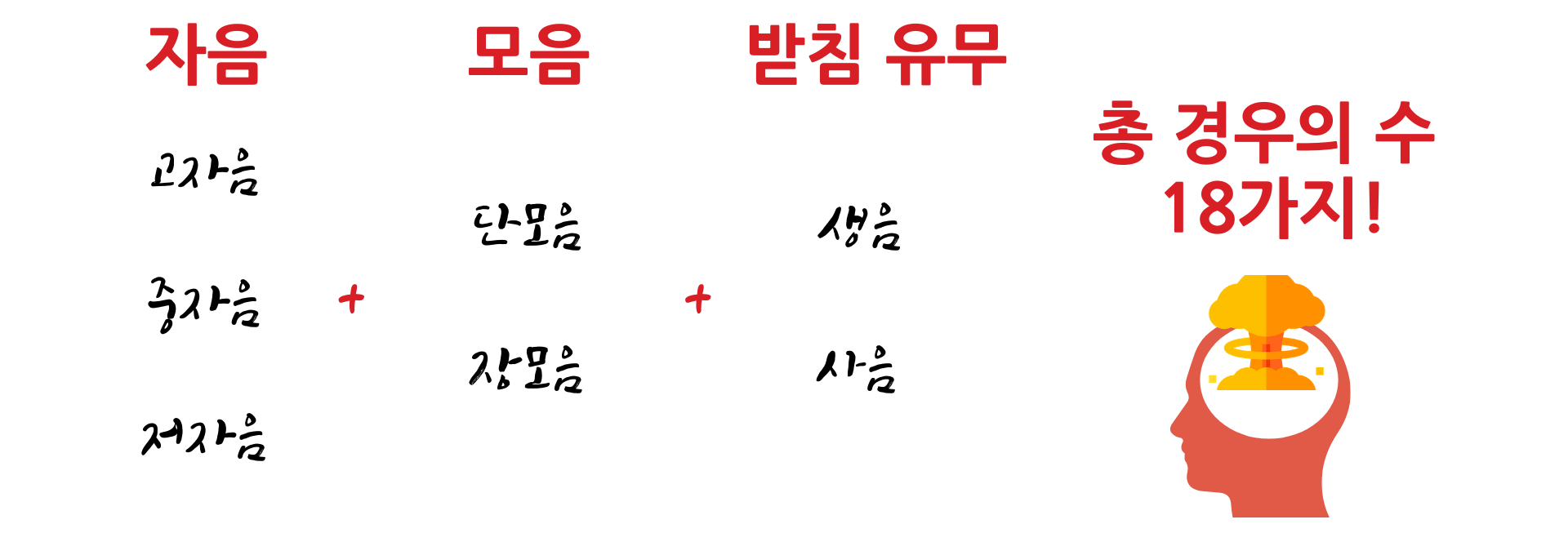 자음 3종과 모음 2종이 결합된 경우의 수만 계산해도 3*2=6개인데, 문제는 자음과 모음에 마지막으로 받침까지 붙을 수 있다. 받침은 생음과 사음 총 2가지로 이것까지 감안하면 경우의 수는 총 3*2+3*2*2=18가지다!!! 그리고 이 경우의 수에 따라 성조가 다 달라진다!!!