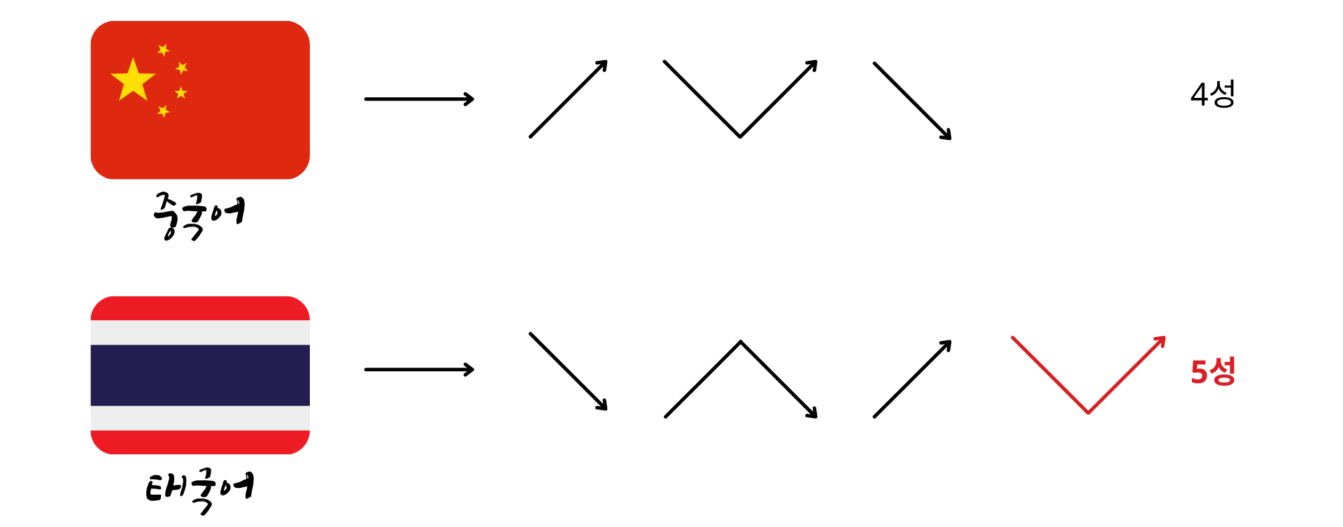 태국어는 발음이 무엇보다 아주 심하게 중요하다. 그 이유는 바로 성조 때문이다. 성조란 음의 높낮이에 따라 뜻이 달라지는 시스템으로 중국어가 4성이 이 이를 대표한다. 그런데 태국어는 여기에 1성을 추가해서 무려 5 성이다. 이게 끝이 아니다. 모음은 또 단음과 장음으로 나누어진다. 같은 음이라도 아! 와 아~는 완전 다른 뜻이다.